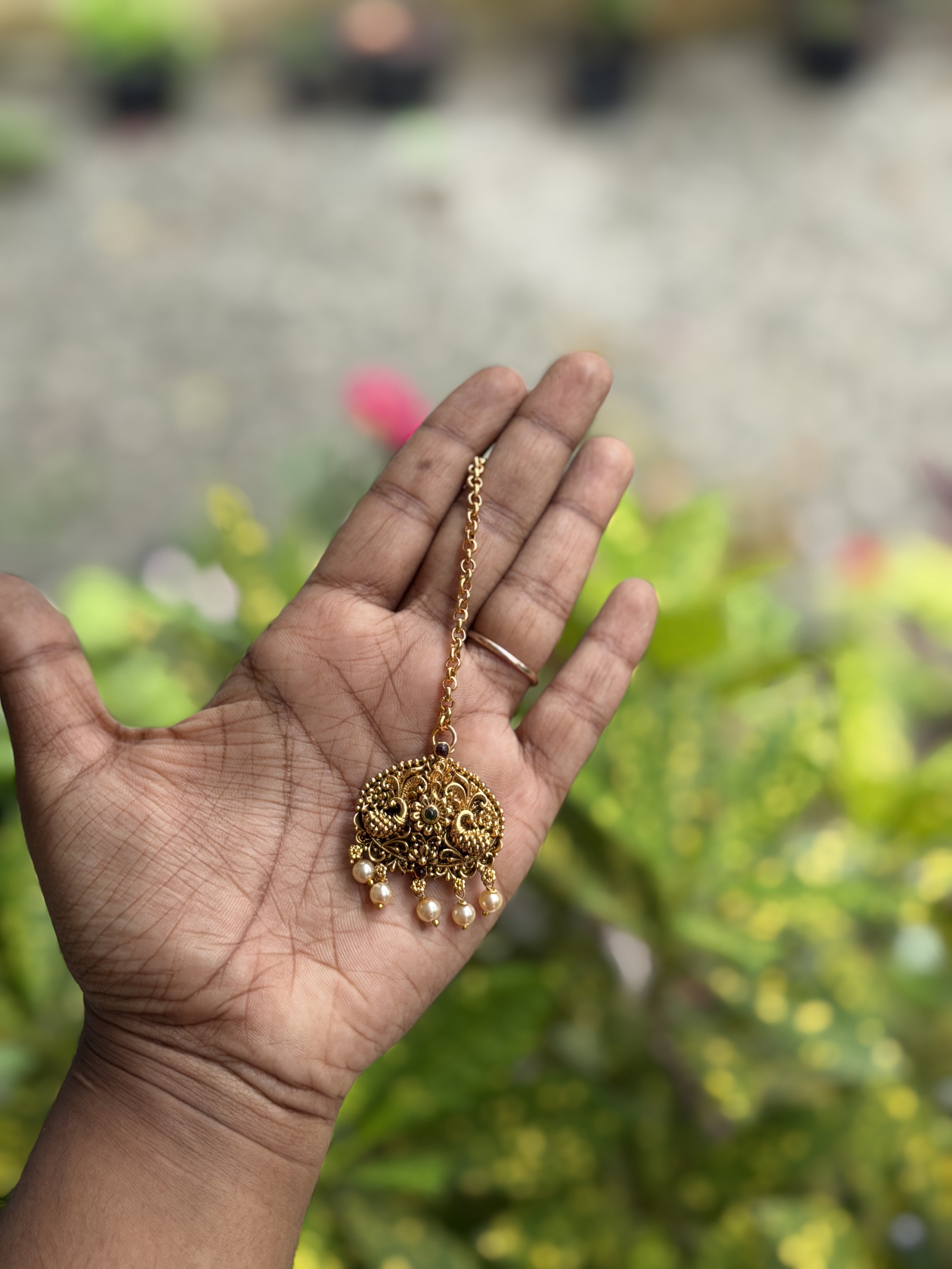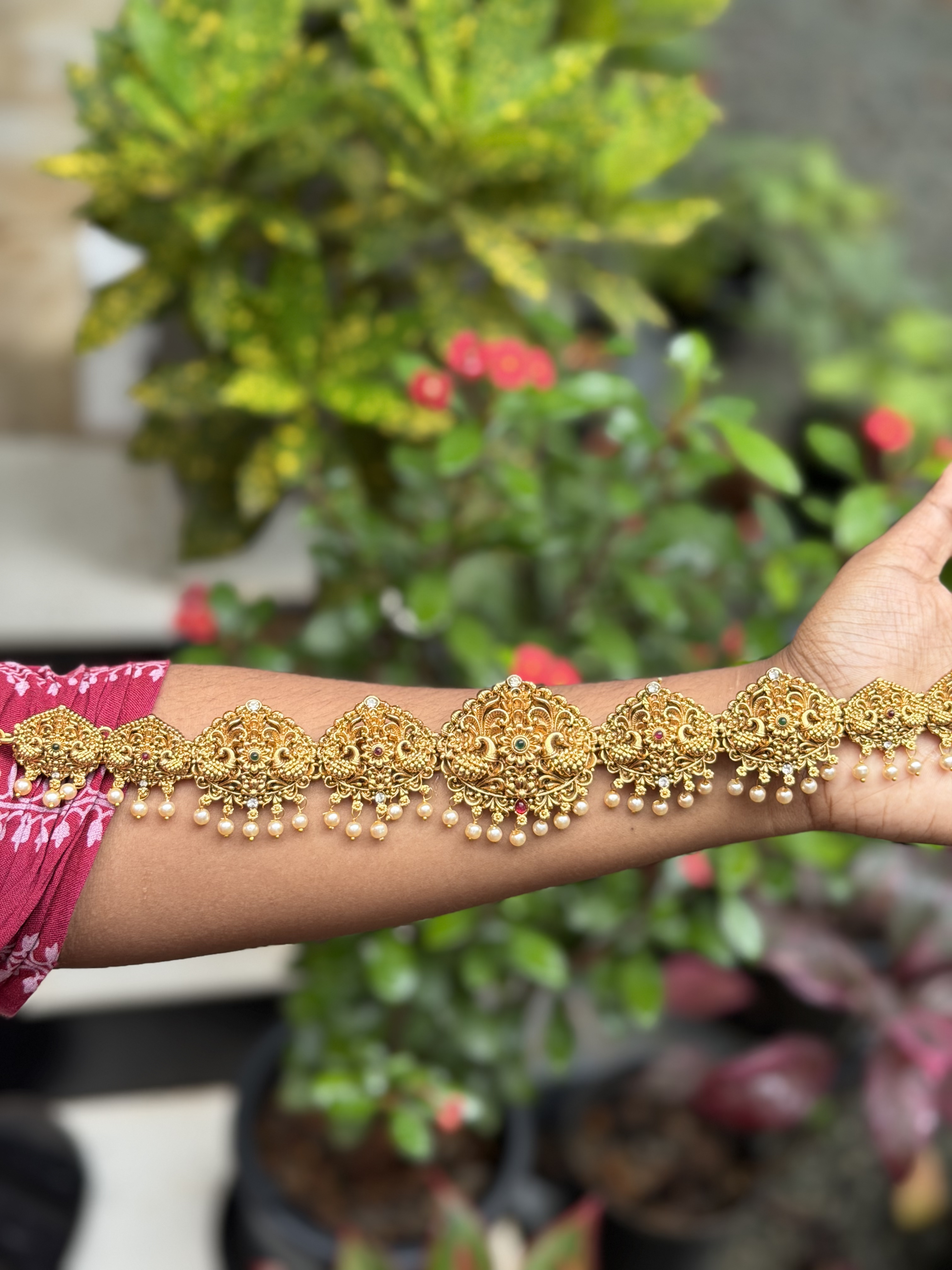 Set Includes: Long Haram, Short Necklace ,Pair of Jhumka Earrings, Maang Tikka, Vaddanam / Waist Belt