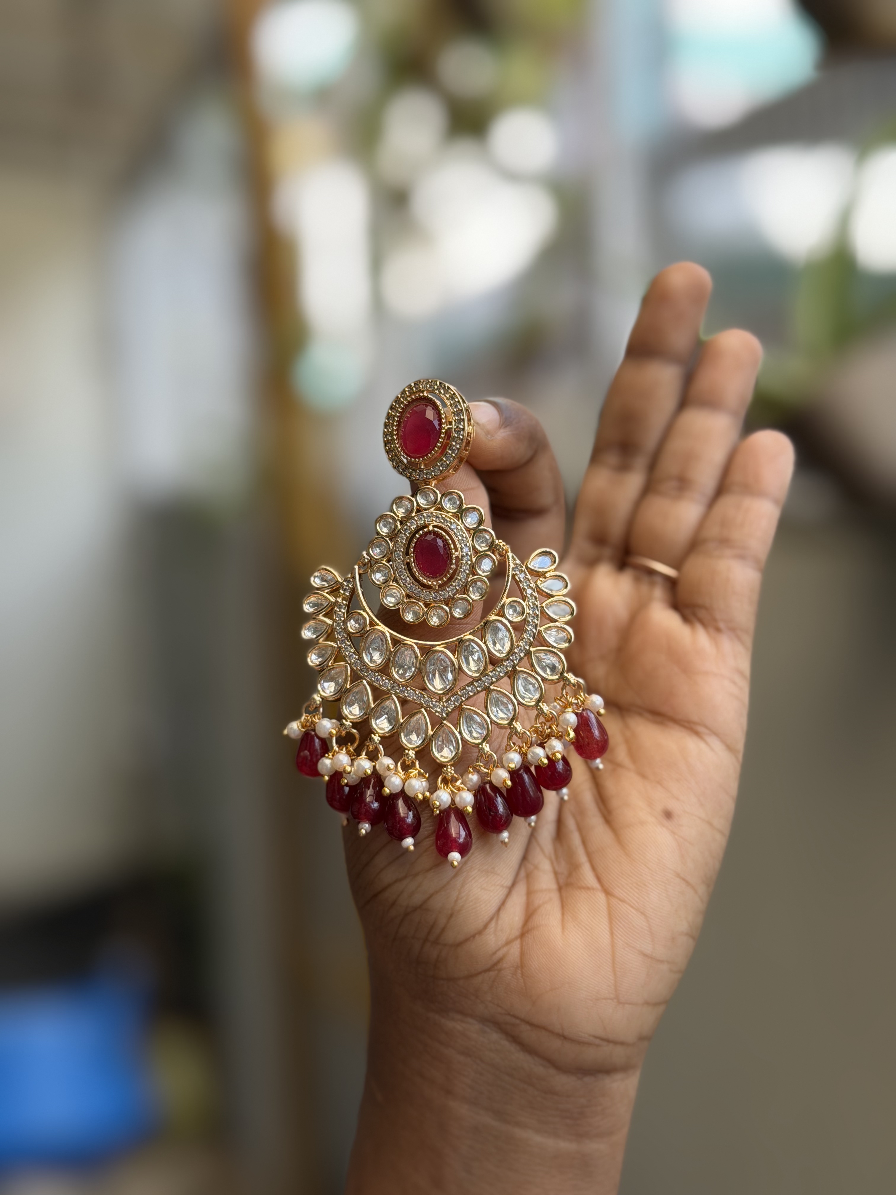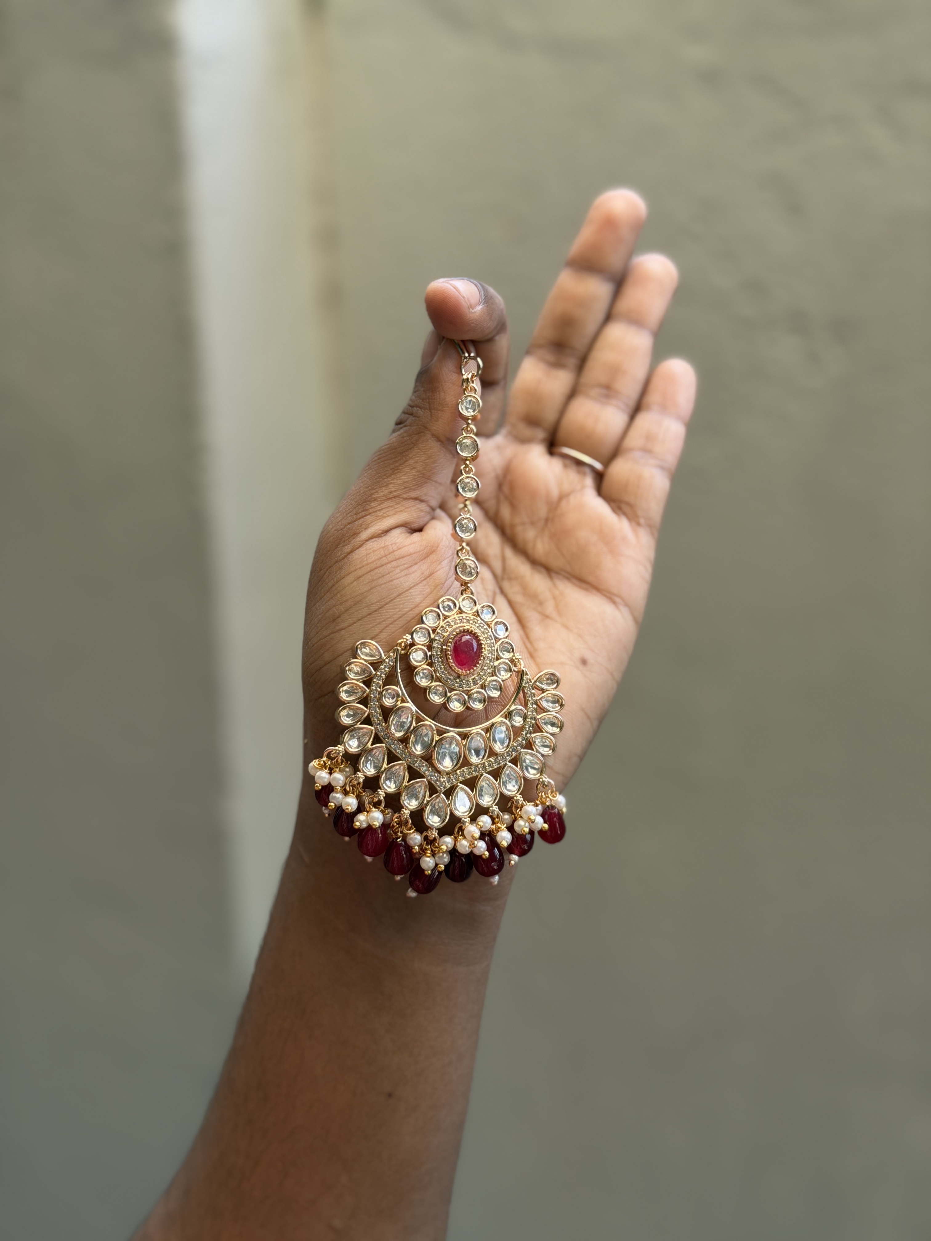 A bridal choker set embellished with premium high-quality sparkling AD stones arranged in layered circular and teardrop patterns,enhanced with pearl drops,comes with a matching earrings and a Maangtika