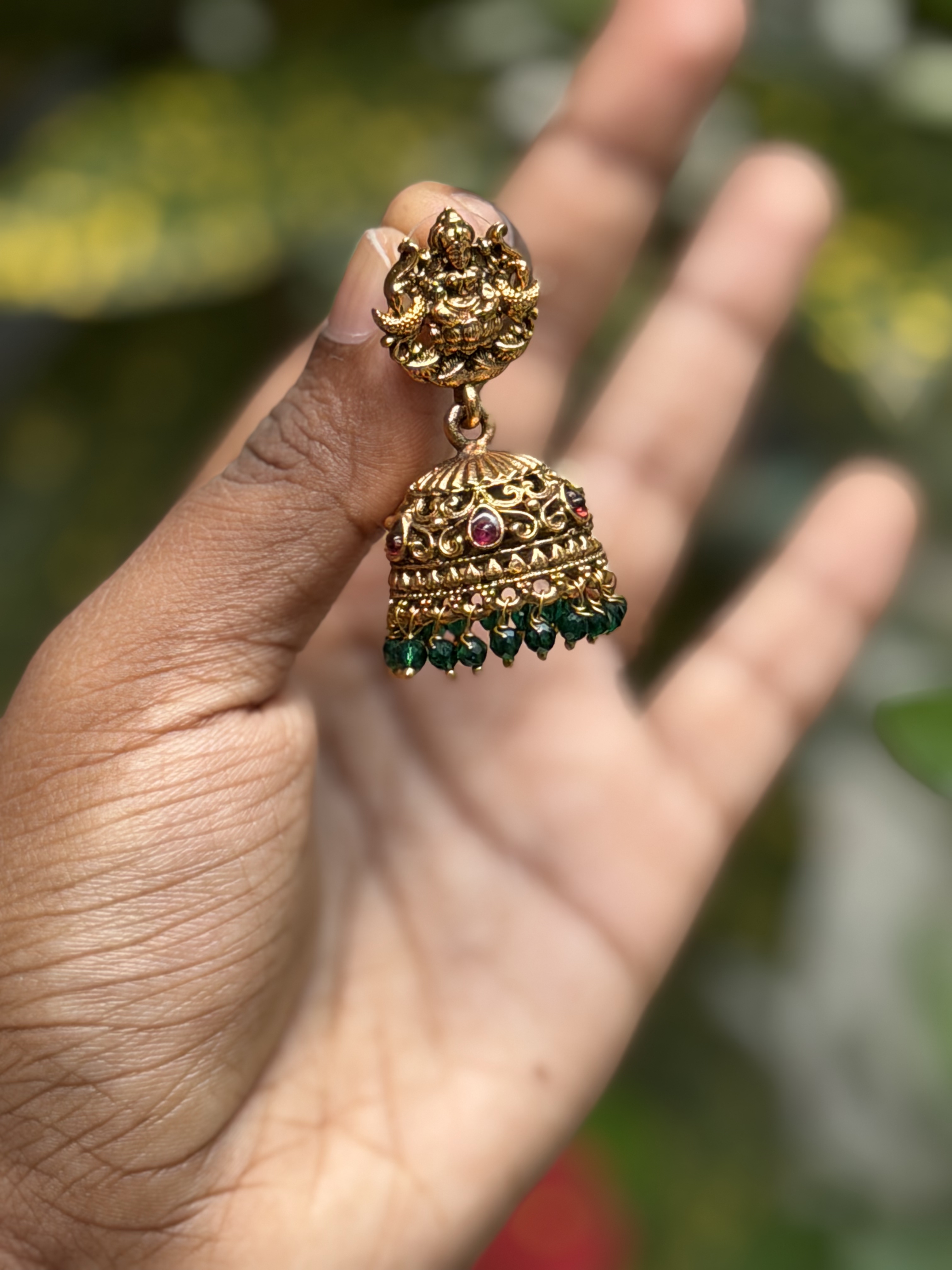 Majestic Lakshmi temple haaram with 3 layered bead strands and antique gold detailing.