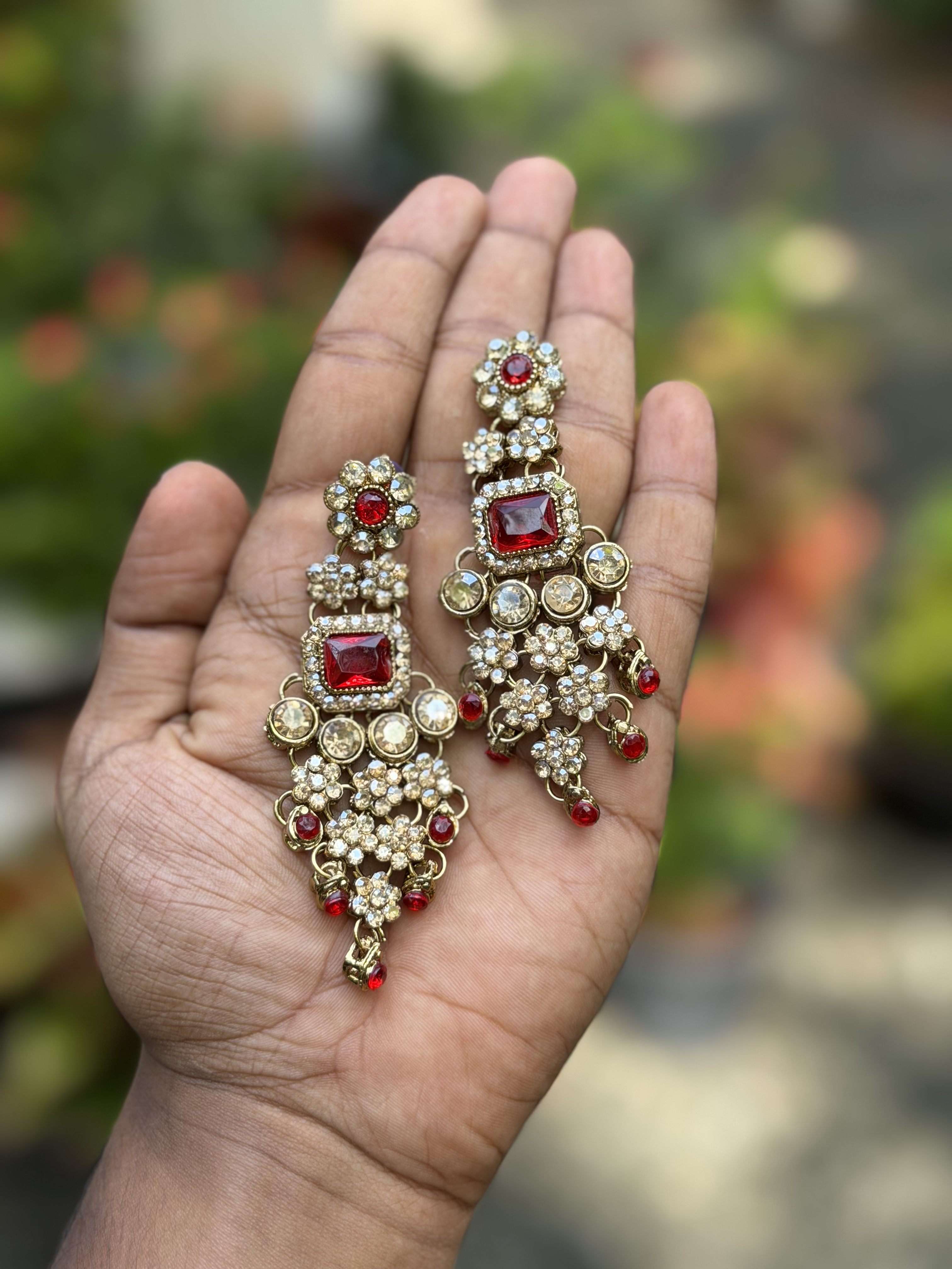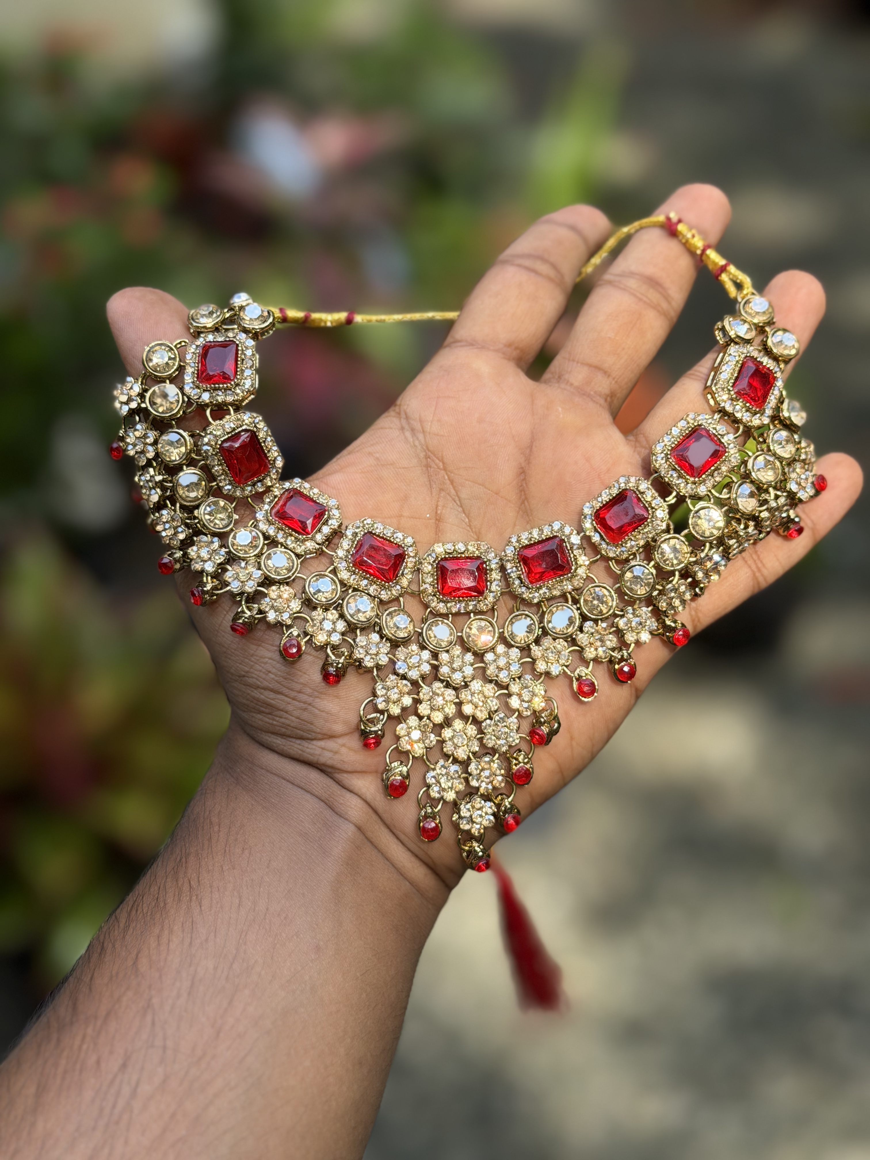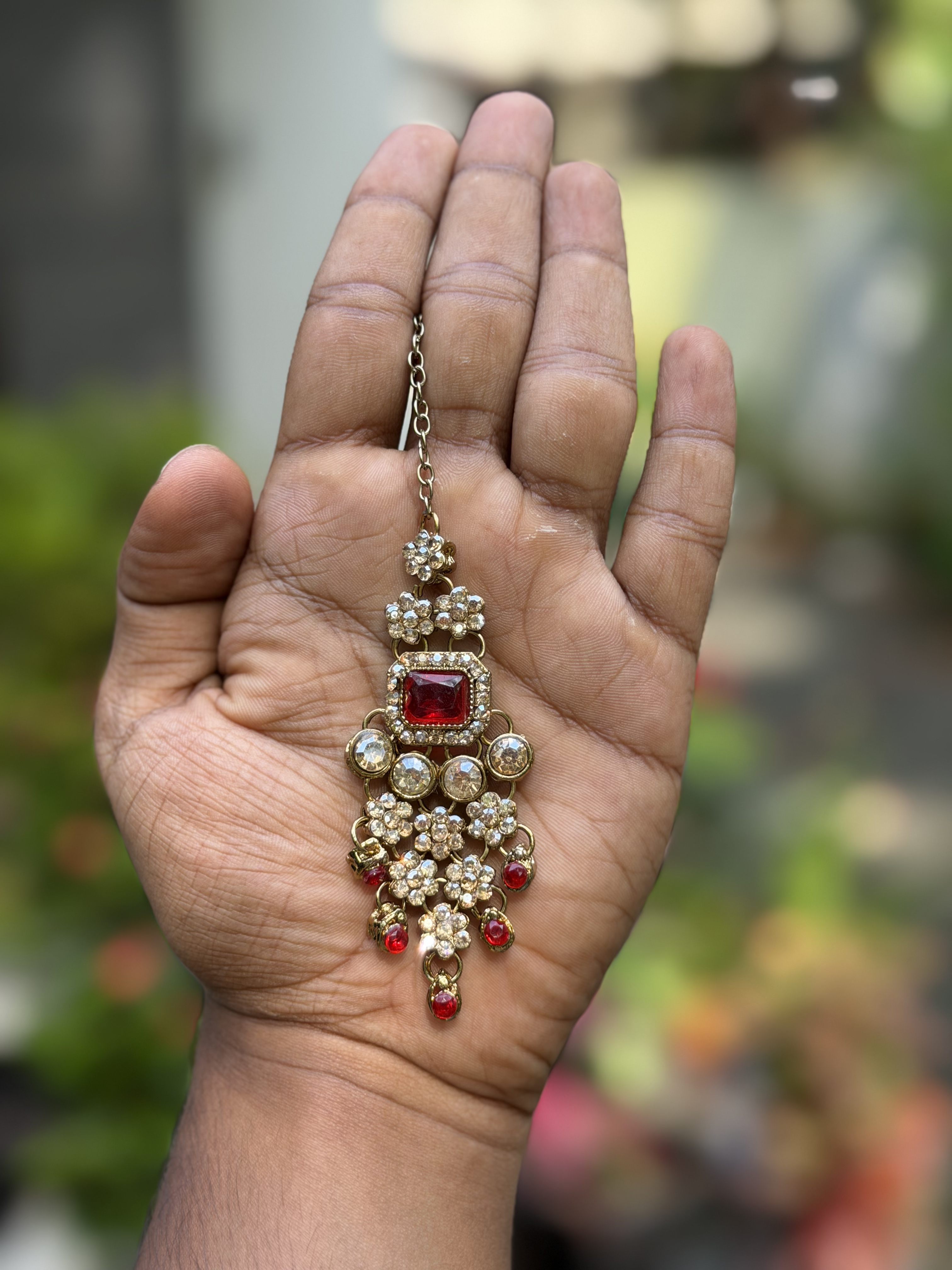 This wedding set consist of one Necklace, a pair of jhumka and a Maangtika. It is made of premium quality stones with a blend of gold plating.
