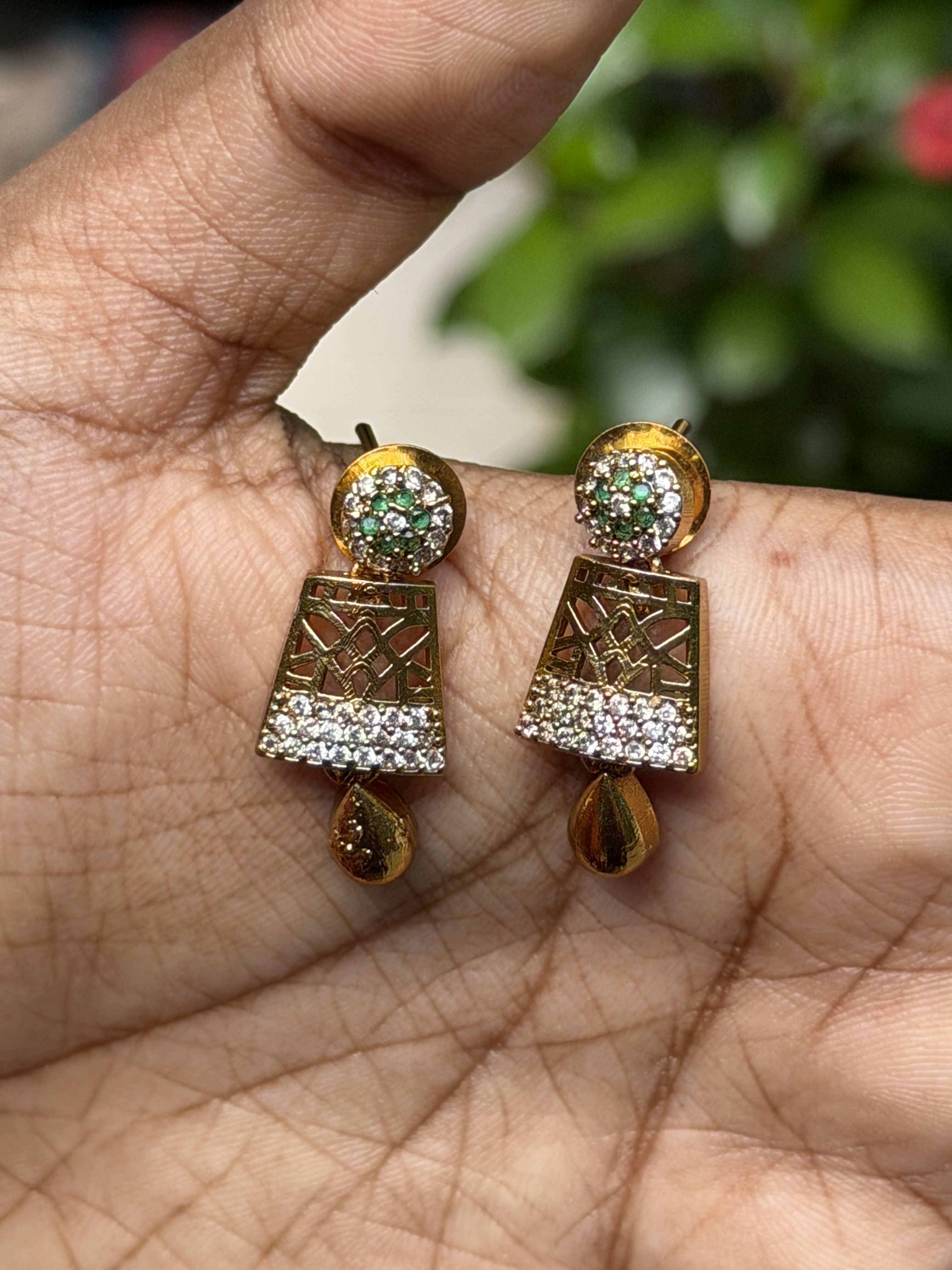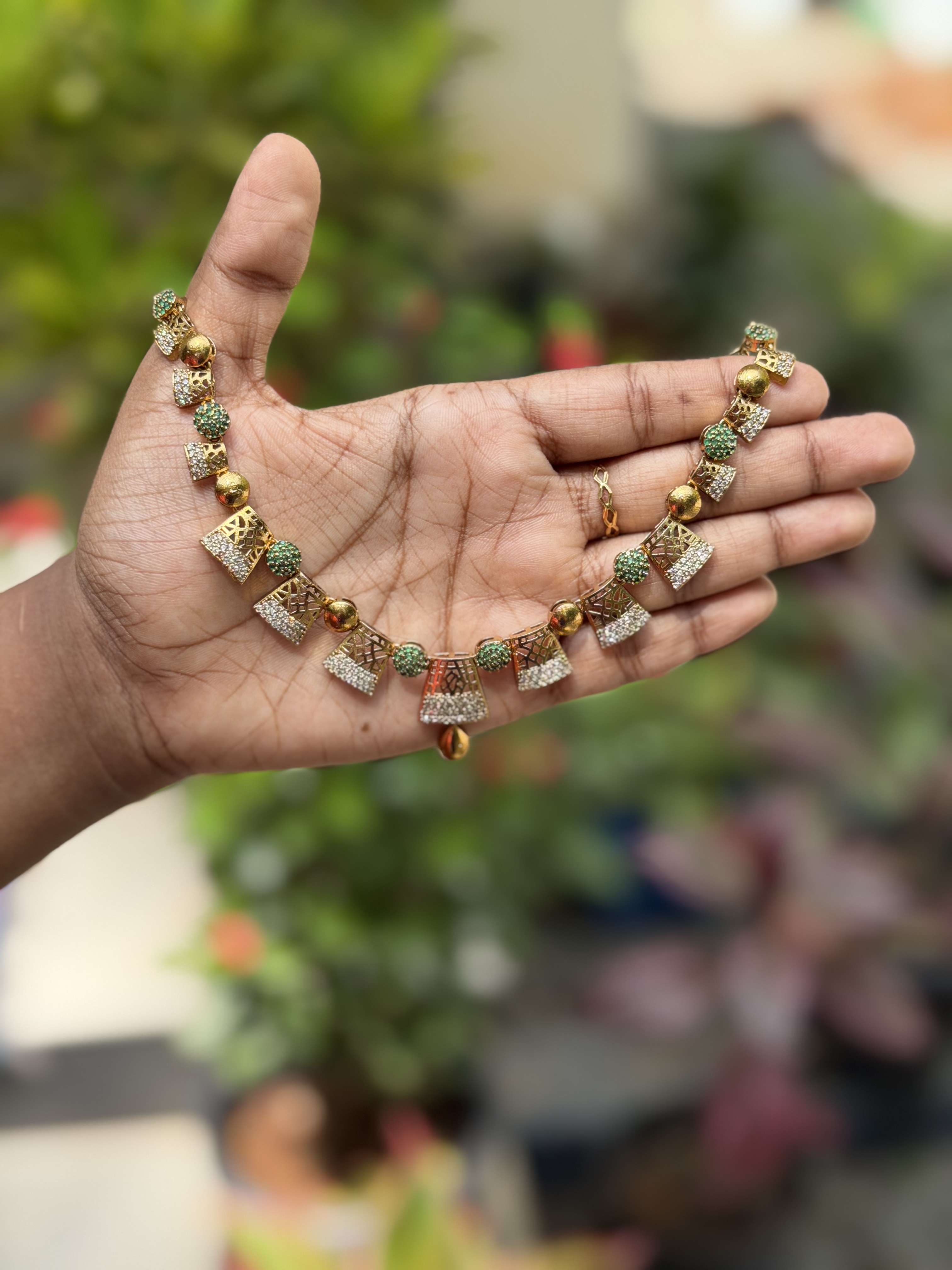 A sleek and contemporary necklace duo that redefines elegance — featuring fine gold-plated detailing with intricate mesh patterns. The collection includes one design enhanced with subtle green accents and another in classic gold, both offering a perfect blend of minimalism and sophistication. Ideal for modern brides, festive occasions, or elegant evening wear
