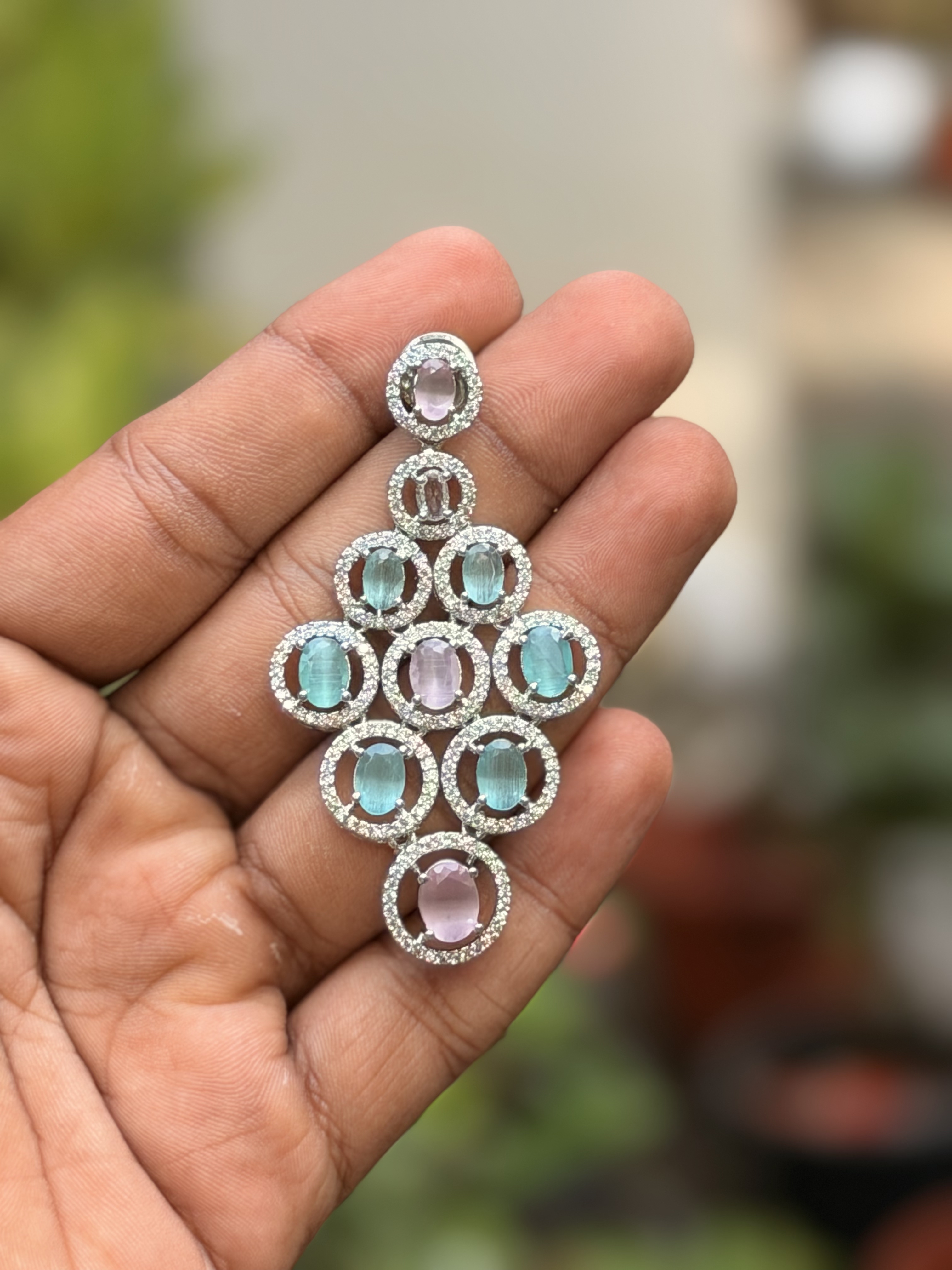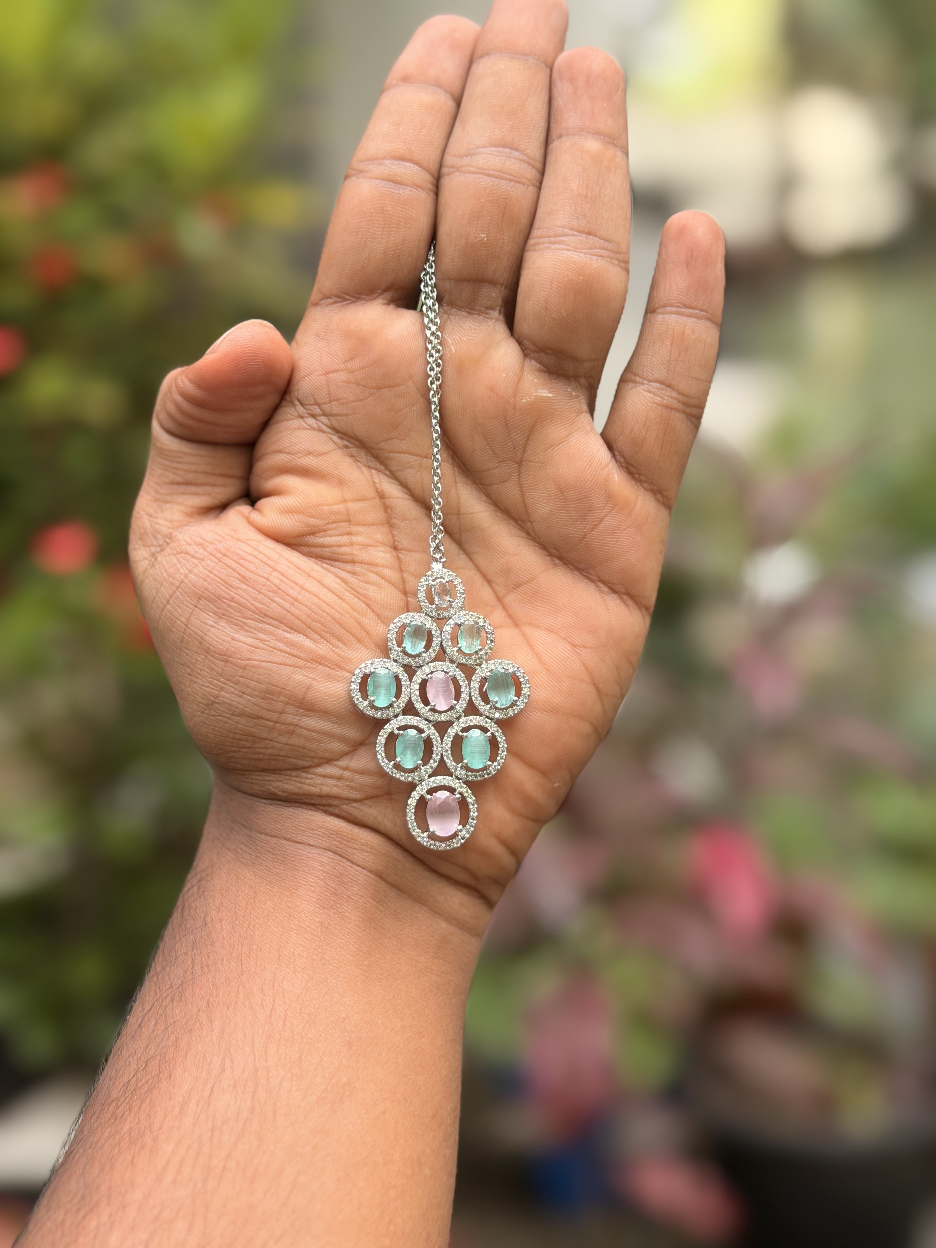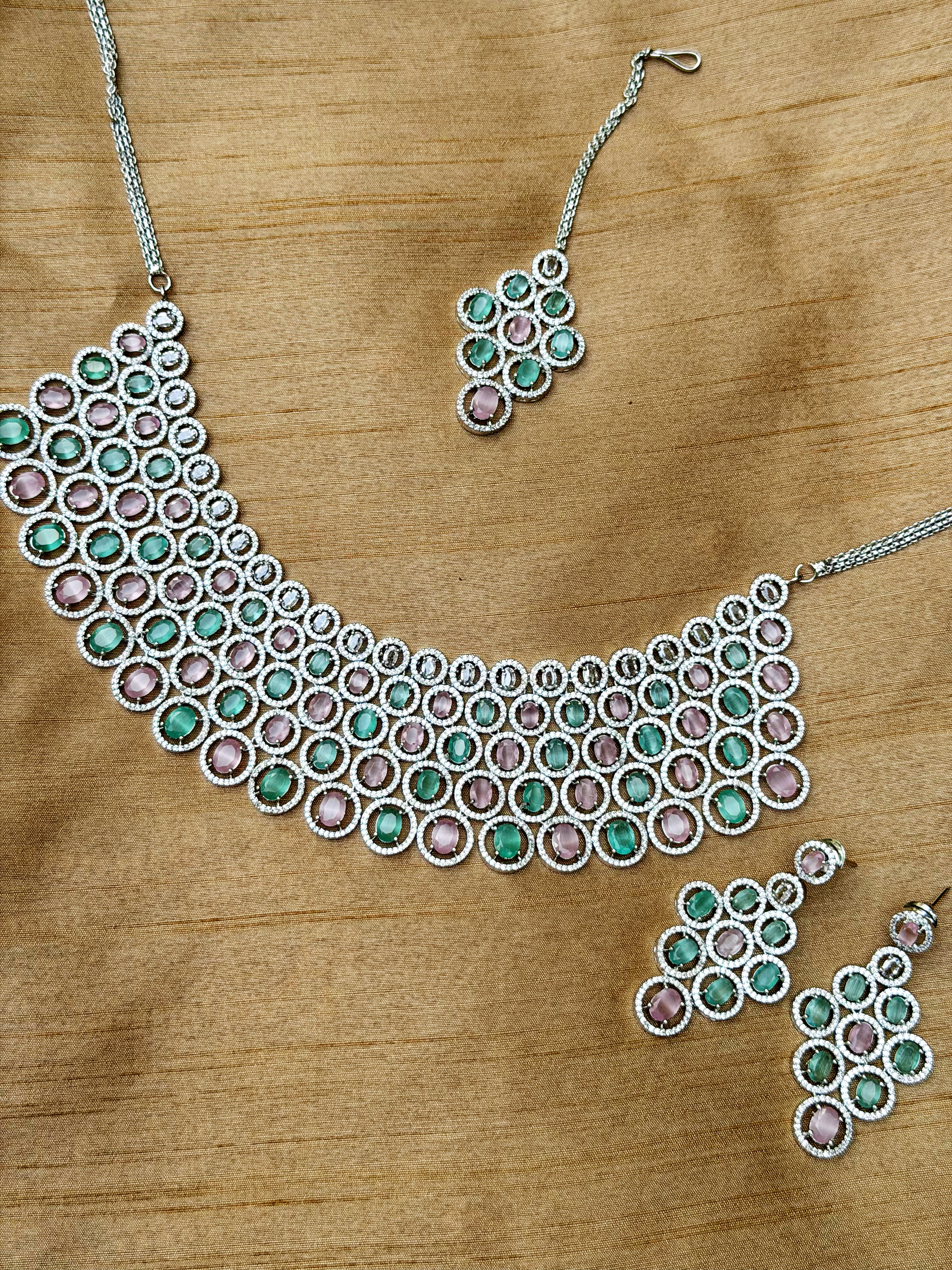 A dazzling AD necklace set adorned with shimmering pink and green stones, intricately crafted with a silver finish and paired with matching earrings and a Maangtika.