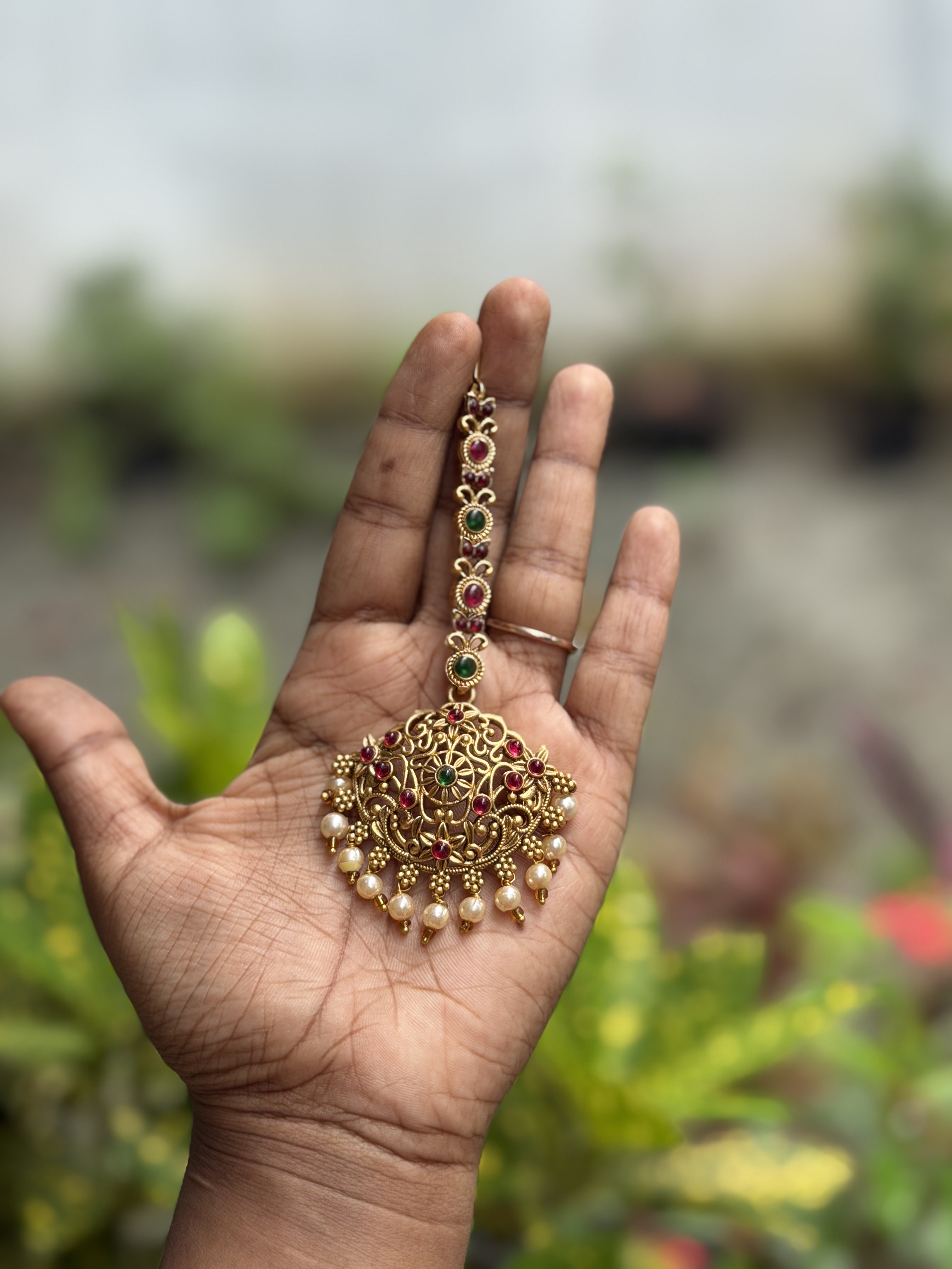 Set Includes: 1 Long Haram ,1 Short Necklace / Choker ,1 Vaddanam (Waist Belt) ,1 Maang Tikka, 1 Pair of Jhumka Earrings