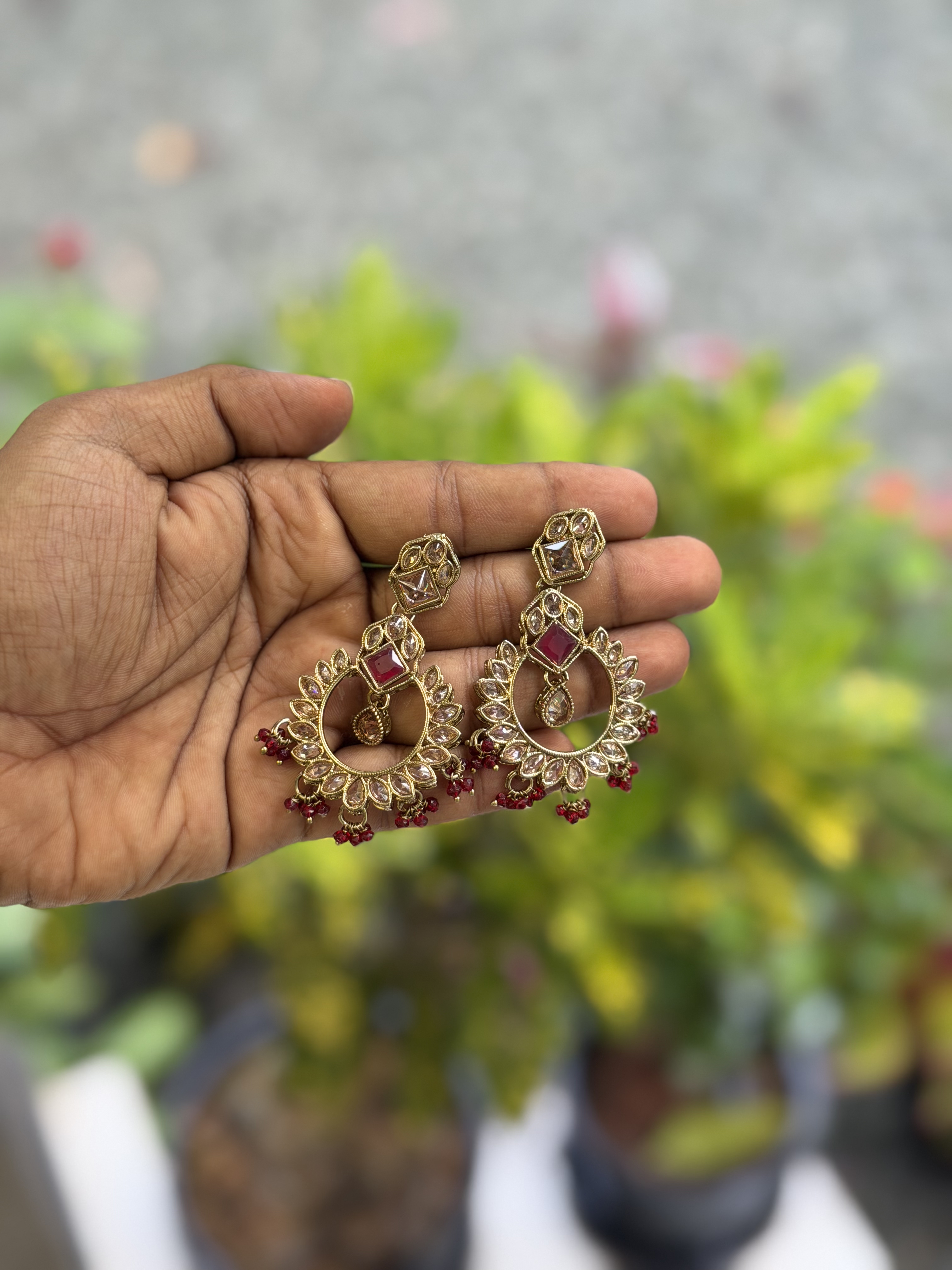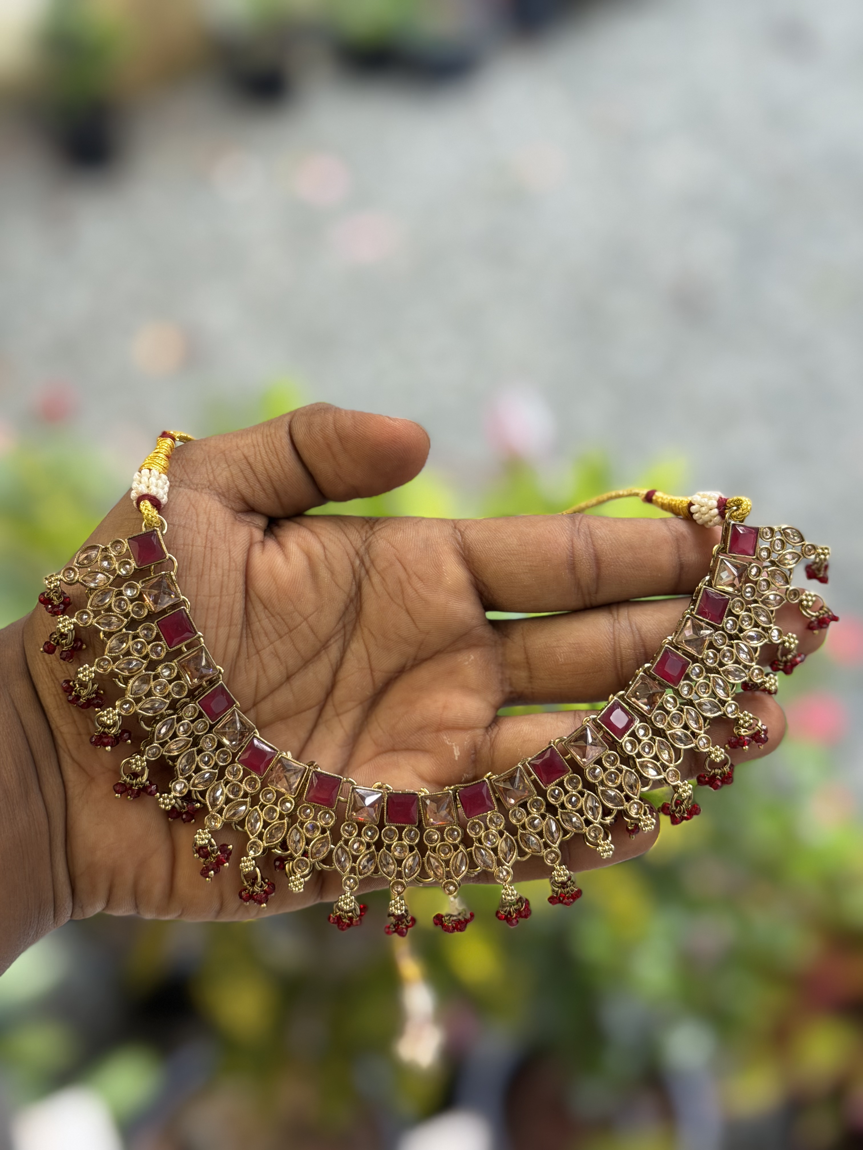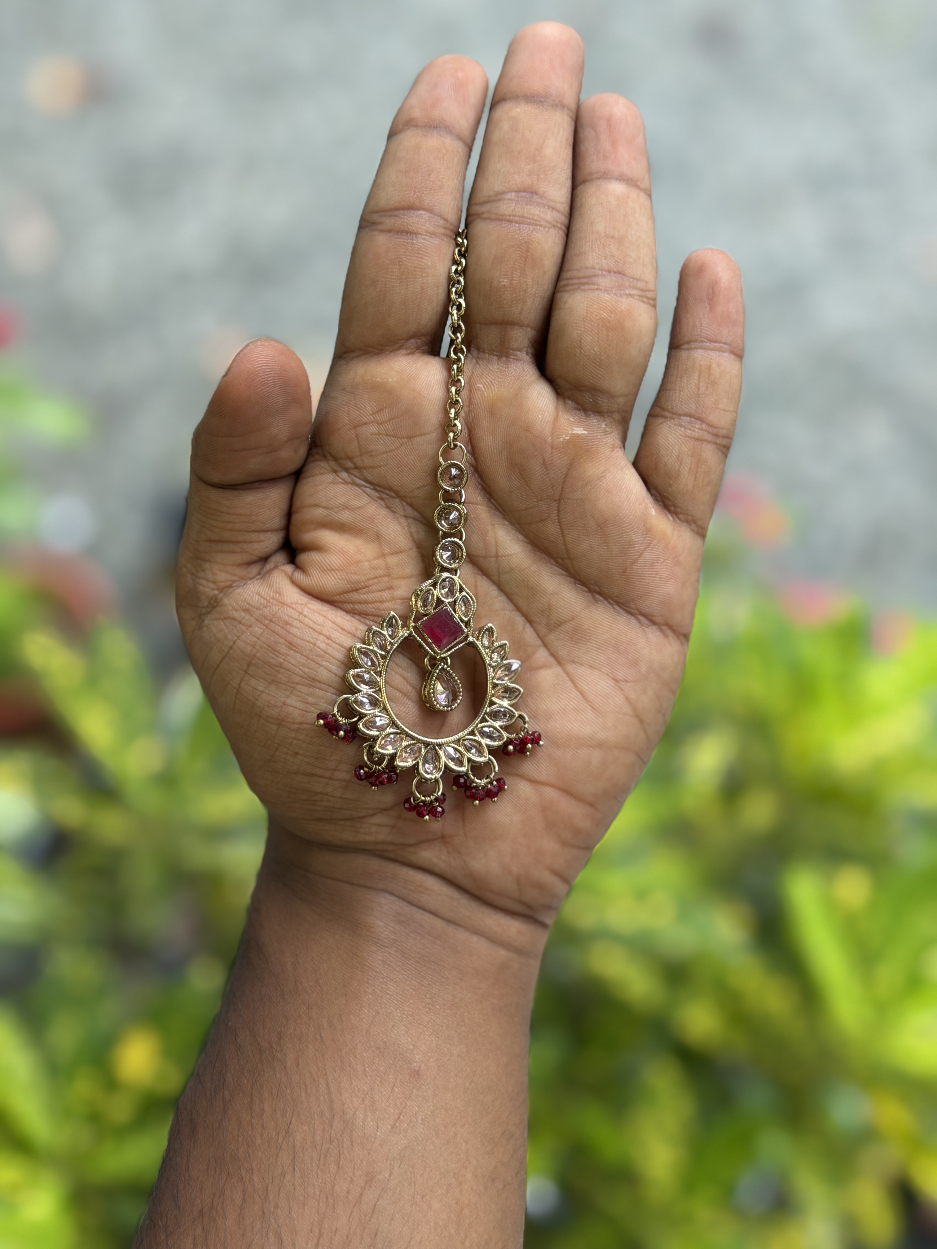 A beautiful antique Ruby necklace featuring rich red stones and delicate Gold detailing, paired with a pair of Jhumka and a Maangtika.