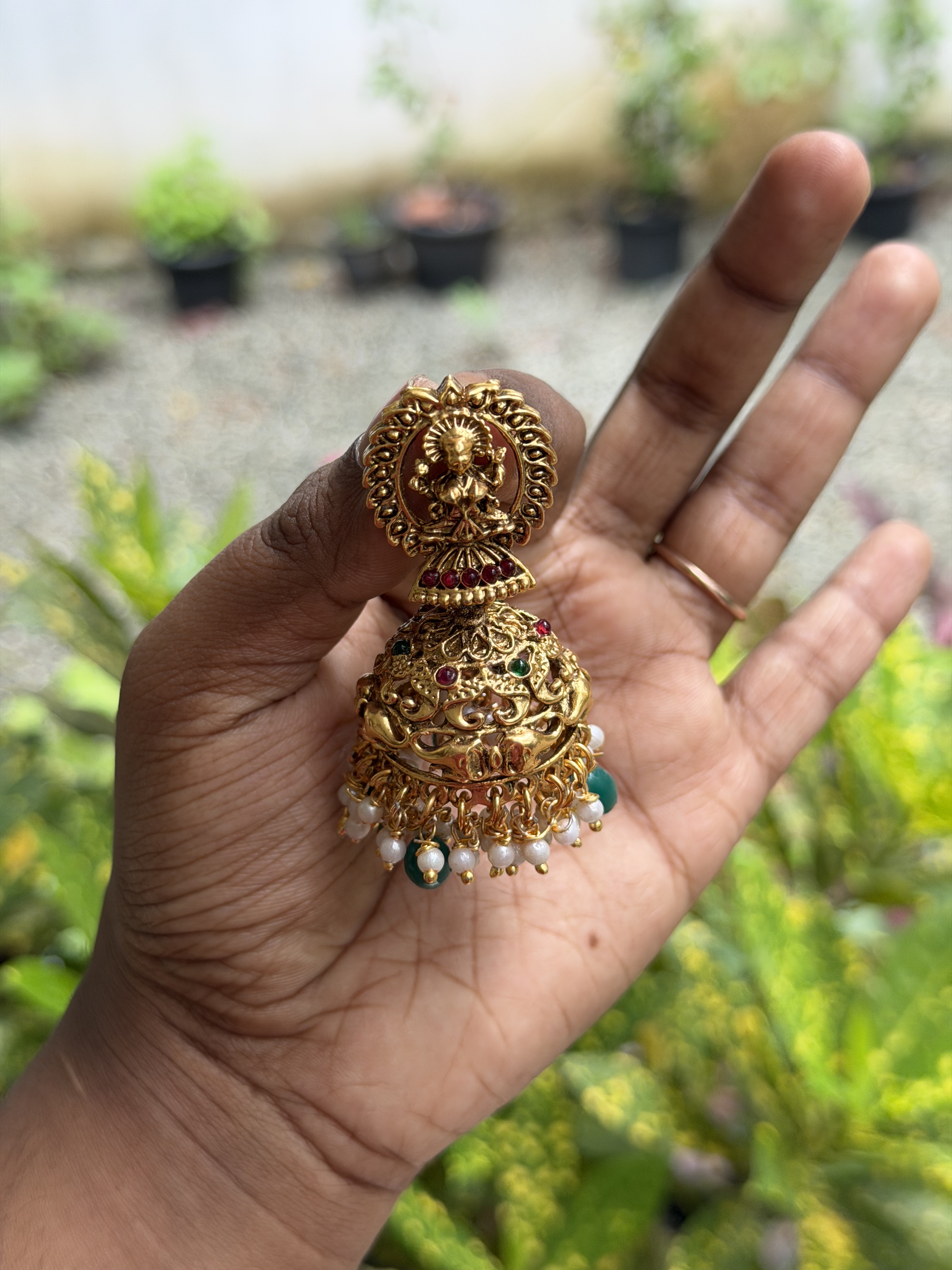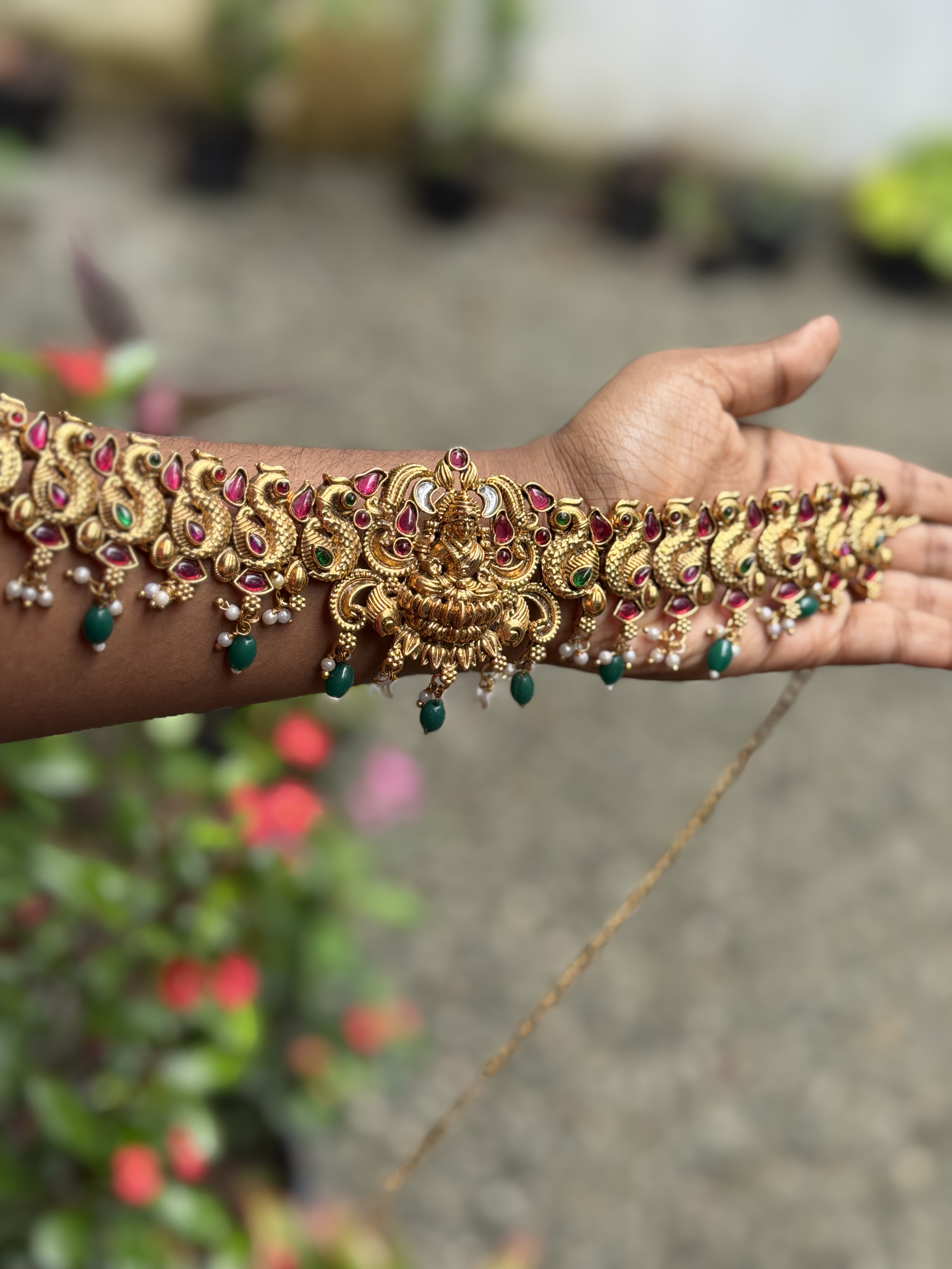 Set includes: 1 choker, 1 haaram, 1 Pair jhumka ,1 Maangtika,1 waist belt